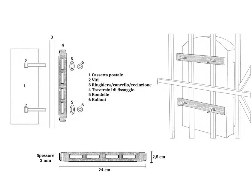 Traversini in acciaio, ideali per il fissaggio delle cassette postali su ringhiere, cancelli e recinzioni.